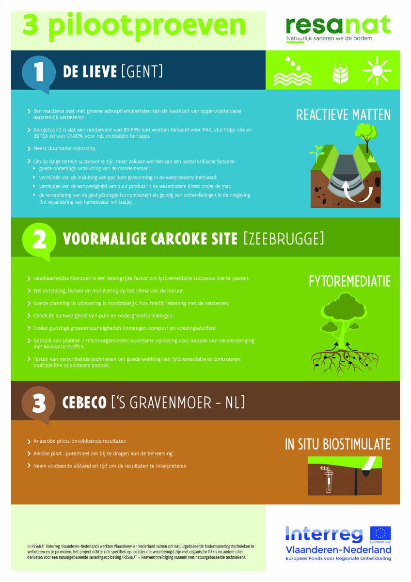 Deux sites pilotes se trouvent en Flandre et un aux Pays-Bas. Il s'agit de la Lieve à Gand, du site de Carcoke à Zeebrugge et d'une zone résidentielle à 's Gravenmoer.
